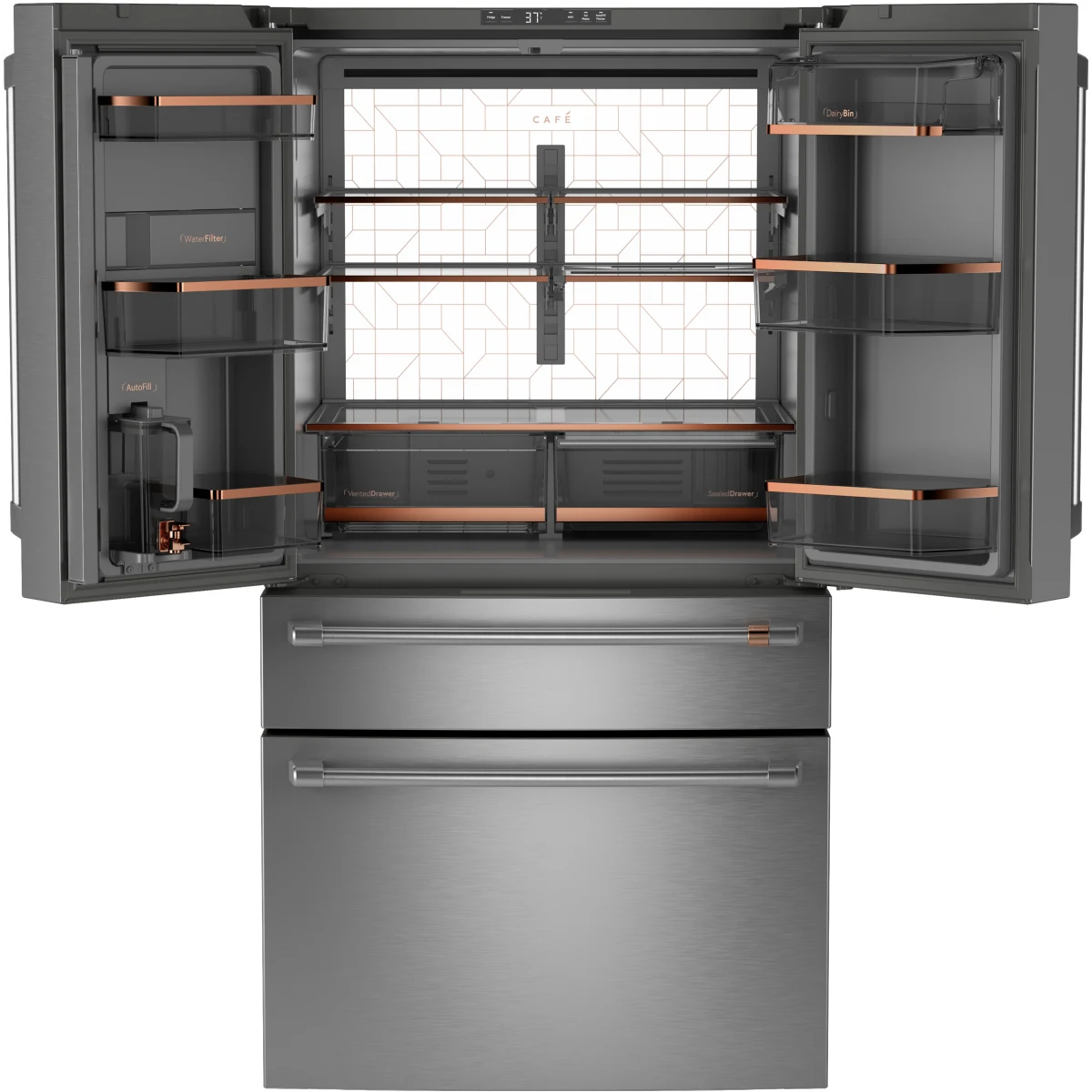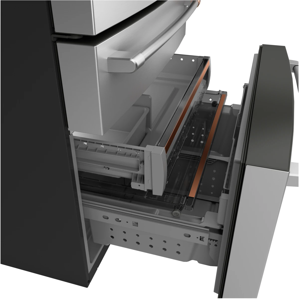 • A slim, full-width Flatbread Freezer Compartment, designed to hold flatbread, pizzas, and other uniquely shaped frozen items is one of the many sliding shelves and trays in this three-level storage system.