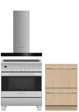 - Range hood: To complete the 4-piece package, a range hood is included. The Fisher & Paykel Series 7 30″ Wall Mounted Range Hood (HC30PCX1) with a powerful 600 CFM fan is a probable match.