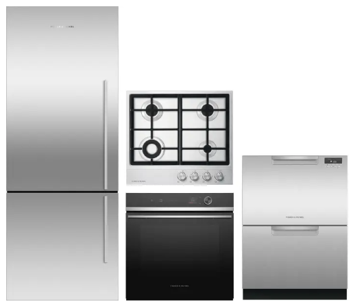 - Bottom freezer refrigerator: A stainless steel bottom freezer refrigerator. A potential included model is the Fisher & Paykel Series 5 13.4 Cu. Ft. Counter Depth Bottom Freezer Refrigerator (RF135BRPX6 N), which features ActiveSmart™ Foodcare technology for temperature control.