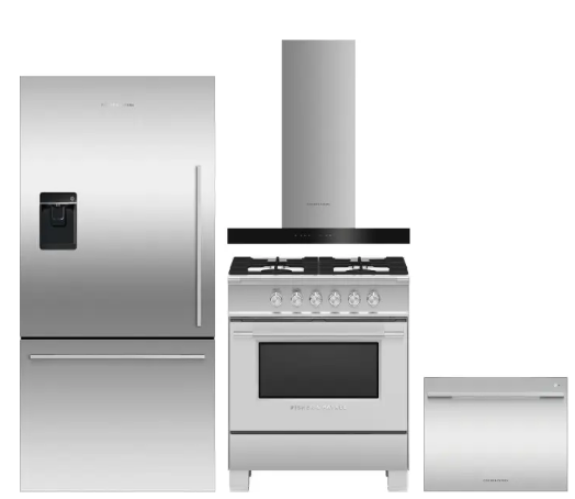 - Range hood: To complete the 4-piece package, a range hood is included. The Fisher & Paykel Series 7 30″ Wall Mounted Range Hood (HC30PCX1) with a powerful 600 CFM fan is a probable match.