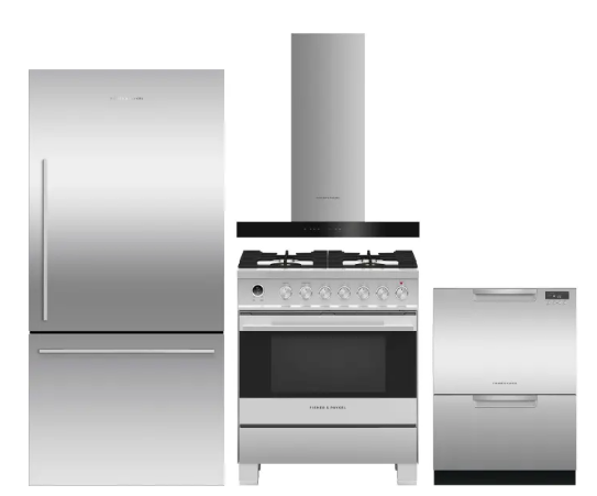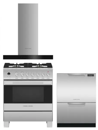 - Range hood: To complete the 4-piece package, a range hood is included. The Fisher & Paykel Series 7 30″ Wall Mounted Range Hood (HC30PCX1) with a powerful 600 CFM fan is a probable match.