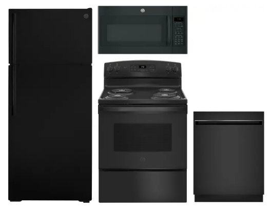 GEGE RERADWMW3313 4 Piece Kitchen Appliances Package with Top Freezer Refrigerator, Electric Range in Black
