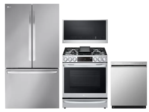 LG LGRERADWMW14262 4 Piece Kitchen Appliances Package with French Door Refrigerator, Gas Range, Dishwasher and Over the Range Microwave in Stainless Steel