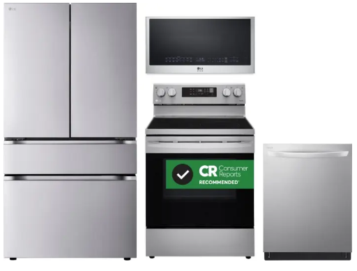 LG LGRERADWMW20987 4 Piece Kitchen Appliances Package with French Door Refrigerator, Electric Range, Dishwasher and Over the Range Microwave in Stainless Steel