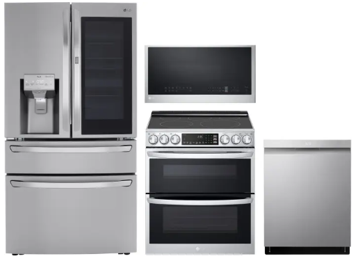 LG LGRERADWMW21148 4 Piece Kitchen Appliances Package with French Door Refrigerator, Electric Range, Dishwasher and Over the Range Microwave in Stainless Steel