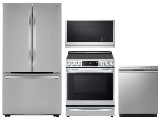 LG LGRERADWMW21224 4 Piece Kitchen Appliances Package with French Door Refrigerator, Electric Range, Dishwasher and Over the Range Microwave in Stainless Steel