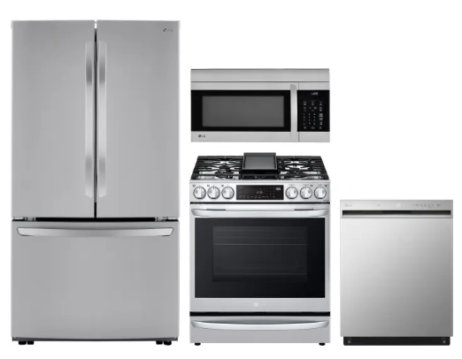 LG LGRERADWMW21231 4 Piece Kitchen Appliances Package with French Door Refrigerator, Gas Range, Dishwasher and Over the Range Microwave in Stainless Stee