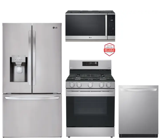 LG LGRERADWMW21248 4 Piece Kitchen Appliances Package with French Door Refrigerator, Gas Range, Dishwasher and Over the Range Microwave in Stainless Steel