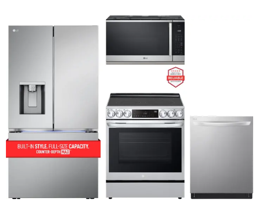 Revitalize your kitchen with this LG appliance ensemble, delivering a blend of sophistication and utility. This collection boasts a sleek side by side refrigerator, complemented by an electric range, an above-range microwave, and a built-in dishwasher. Elevate your culinary space with LG! Where advanced functionality meets timeless design, presenting an ideal enhancement for your kitchen.