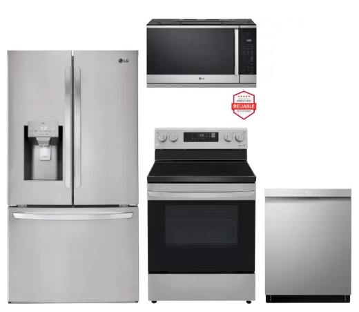 LG LGRERADWMW21265 4 Piece Kitchen Appliances Package with French Door Refrigerator, Electric Range, Dishwasher and Over the Range Microwave in Stainless Steel