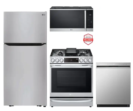 LG LGRERADWMW21282 4 Piece Kitchen Appliances Package with Top Freezer Refrigerator, Gas Range, Dishwasher and Over the Range Microwave in Stainless Steel
