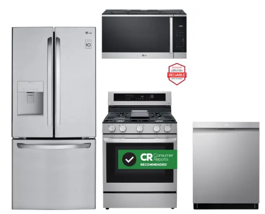 LG LGRERADWMW21293 4 Piece Kitchen Appliances Package with French Door Refrigerator, Gas Range, Dishwasher and Over the Range Microwave in Stainless Steel