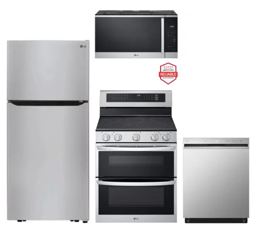 LG LGRERADWMW21294 4 Piece Kitchen Appliances Package with Top Freezer Refrigerator, Electric Range, Dishwasher and Over the Range Microwave in Stainless Steel
