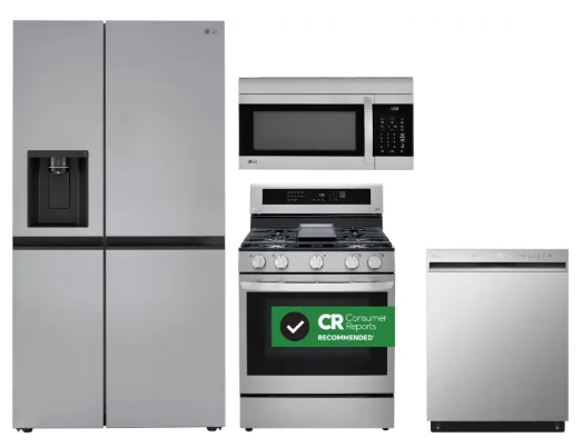 LG LGRERADWMW3799 4 Piece Kitchen Appliances Package with Side-by-Side Refrigerator, Gas Range, Dishwasher and Over the Range Microwave in Stainless Steel