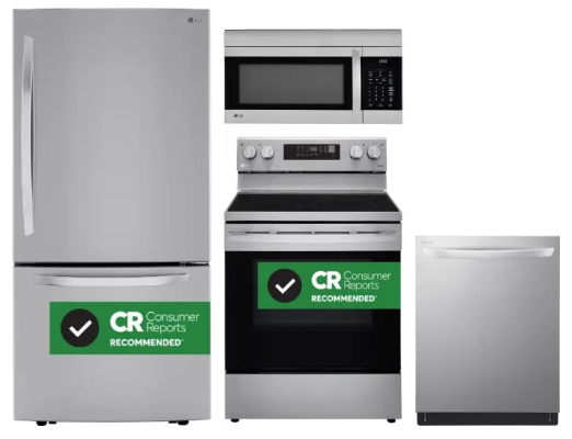 LG LGRERADWMW3814 4 Piece Kitchen Appliances Package with Bottom Freezer Refrigerator, Electric Range, Dishwasher and Over the Range Microwave in Stainless Steel