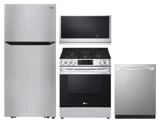 LG LGRERADWMW3963 4 Piece Kitchen Appliances Package with Top Freezer Refrigerator, Gas Range, Dishwasher and Over the Range Microwave in Stainless Steel