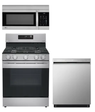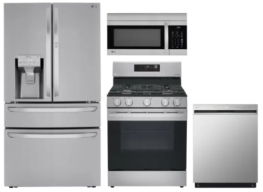 LG LGRERADWMW3982 4 Piece Kitchen Appliances Package with French Door Refrigerator, Gas Range, Dishwasher and Over the Range Microwave in Stainless Steel