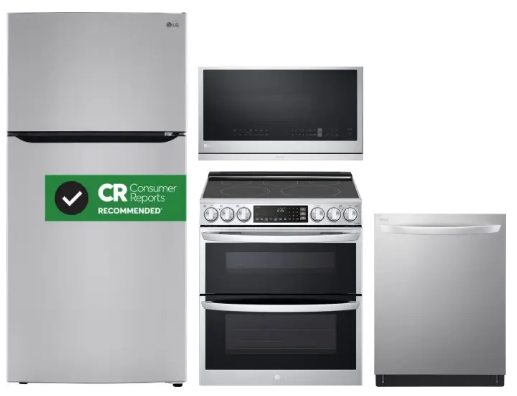LG LGRERADWMW3996 4 Piece Kitchen Appliances Package with Top Freezer Refrigerator, Electric Range, Dishwasher and Over the Range Microwave in Stainless Steel