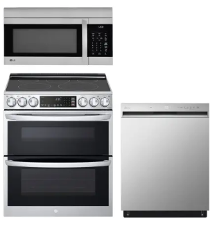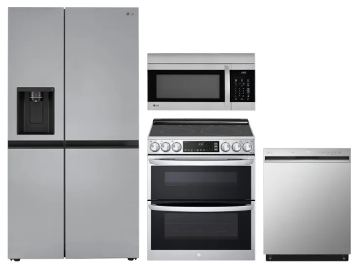 LG LGRERADWMW4000 4 Piece Kitchen Appliances Package with Side-by-Side Refrigerator, Electric Range, Dishwasher and Over the Range Microwave in Stainless Steel
