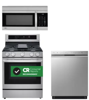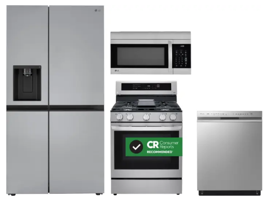 LG LGRERADWMW4046 4 Piece Kitchen Appliances Package with Side-by-Side Refrigerator, Gas Range, Dishwasher and Over the Range Microwave in Stainless Steel