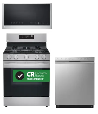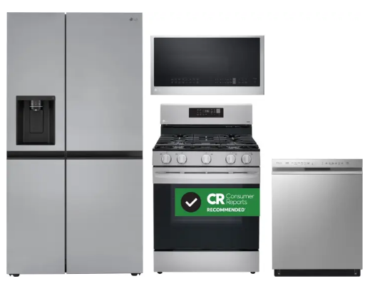 LG LGRERADWMW4092 4 Piece Kitchen Appliances Package with Side-by-Side Refrigerator, Gas Range, Dishwasher and Over the Range Microwave in Stainless Steel