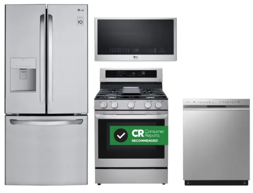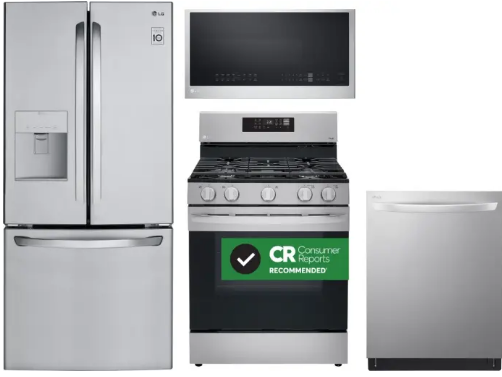 LG LGRERADWMW4152 4 Piece Kitchen Appliances Package with French Door Refrigerator, Gas Range, Dishwasher and Over the Range Microwave in Stainless Steel