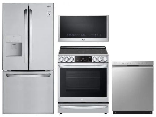 LG LGRERADWMW4155 4 Piece Kitchen Appliances Package with French Door Refrigerator, Electric Range, Dishwasher and Over the Range Microwave in Stainless Steel