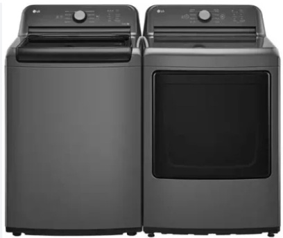 The LG LGWADRECM6105 is a side-by-side laundry pair featuring a top-load washer (model WT6105CM) and an electric dryer (model DLE6100M). It comes in a monochrome gray or “Graphite Steel” finish.